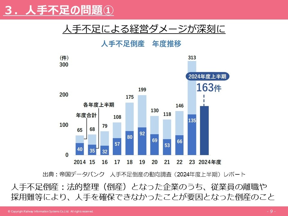今、この人手不足による経営ダメージが深刻になっているというようなデータが出ています。帝国データバンクが出してる2024年度上半期のレポートでは、163件が人手不足倒産と呼ばれる理由で、倒産に至ったと報告されています。上半期だけで、倒産件数が確実に昨年度を超えるだろうと予測されていて、これは従業員の離職であったり採用難で人手が確保できなかったりというのが、主な要因として考えられています。