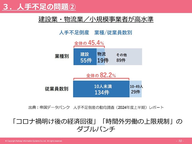 このレポートには、業種別の人手不足倒産件数が出ており、特に建設業・物流業が全体の45.4%をしめていて、非常に集中している報告となっています。従業員数別で見ると、従業員が少ない10人未満の小規模事業者が全体の82.2%をしめており、非常に多くなっています。これはコロナ渦明け後の経済回復、時間外労働の上限規制、これらのダブルパンチで、こういった倒産が多くなったのではないかと言われています。