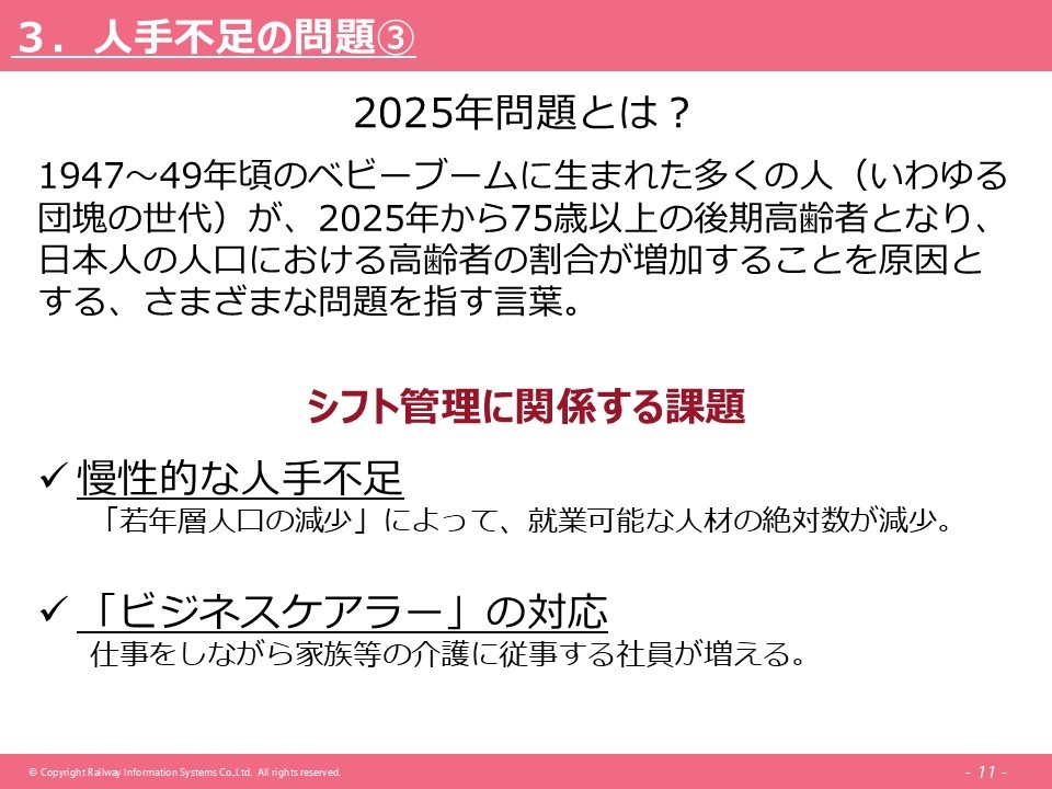 あとは、2025年問題というのがあります。この先もずっといろんな問題があるかと思いますが、我々のシフト管理をする上でも、キーワード(課題)になっていて、ベビーブームに生まれた多くの人、いわゆる団塊の世代の人ですね、それらの方々が2025年から75歳以上の後期高齢者になりますので、人口における高齢者の割合が増加し、様々な問題が出るのではないかと言われています。シフト管理に関係する課題といえば、慢性的な人手不足、今も人手不足なのですが、これがずっと続くということが言われていて、そういったところが一つ問題としてあると考えています。