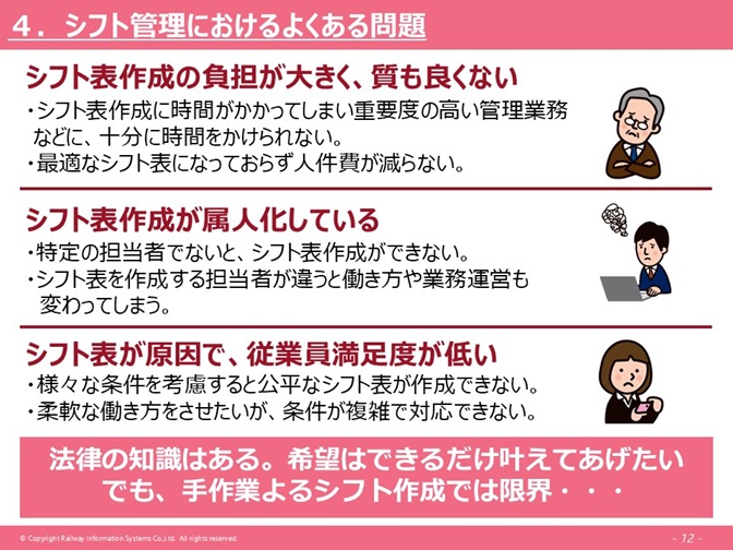 シフト表自体が働いている方々にとっては、すごく関心が高いのです。毎月、来月どういう働き方をするのか、きちんと休みを取れたかなど、すごく関心が高くて、そこの部分で、例えば、不公平感を持ってしまうと、すごくやる気を下げてしまったりとか、そういったことにも繋がるのです。シフト表を作る人も、公平なものを作りたいとは思っていますが、先ほどの法律(働き方改革関連法)であったりとか、人が足りないとか、そういった点を考慮すると、条件が複雑になり、もう人の手だけではなかなか(対応が)難しい、そういったケースもあります。