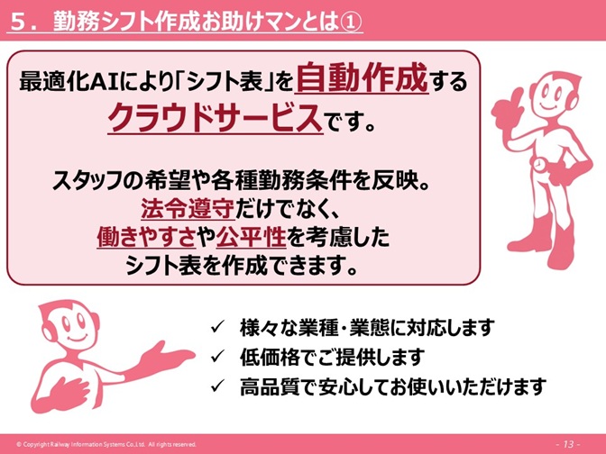 弊社がご提案している、「勤務シフト作成お助けマン」というサービスですが、こちらは最適化AIという技術を使ってシフト表を自動作成する、クラウドサービスになります。スタッフの希望、各種勤務条件を反映させることはもちろん、それ以外に、法令遵守だけではなくて、働きやすさとか、公平性、そのあたりを考慮した上で、シフト表を作成することができるサービスになります。