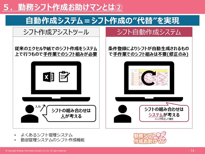 ただ我々は、それだけだとこのシフト表を組む作業という部分に関しては、あまり工数を削減できないだろうと考えており、この部分の条件を入れることで自動生成され、最適なシフト表が出来上がるパズルみたいな作業はこのシステムが考えてくれるというサービスが、弊社の「勤務シフト作成お助けマン」になります。