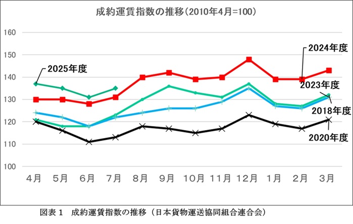 図表1で示した折れ線グラフの月ごとの数字は2010年4月の成約運賃を100とした指数で表されている。グラフによれば、「宅配クライシス」で2018年に上昇したトラック運賃は2020年の新型コロナによる物量減少で下落したのち、2024年問題が話題となり始めた2023年から上昇に転じ、昨年から2025年度にかけ統計開始以来最高の水準で上昇を続けている。直近では、ボトムの2020年度に比較し、20ポイント近くのアップとなっている。