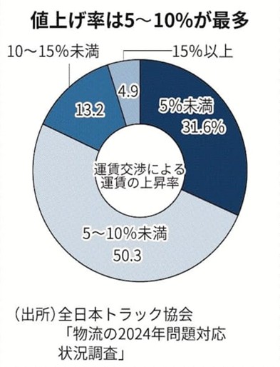 値上げ率は5%未満が3割強、5~10%未満が半分である。つまり約8割の事業者の値上げ率は10%に達していない。これも以前取り上げたが、昨年政府が公表した、運送会社が健全に経営するための運賃指標「標準的運賃」に対して、実勢運賃は6~8割の水準に留まっている実態を考慮すれば、この程度の値上げでは不十分と言わざるを得ない。実際、「全然足りない」という運送会社の声はよく聞く。ドライバーの待遇を他産業並みに引き上げていくにはより踏み込んだ値上げが必要なのである。