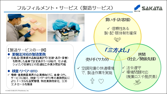 また、薬機法対応倉庫における化粧品・医薬部外品の包装・表示・保管、セット組やシュリンク包装などの流通加工、電機・産業機器分野での検査・リペア・BTOまで、製造領域を含めたフルフィルメントサービスを提供。