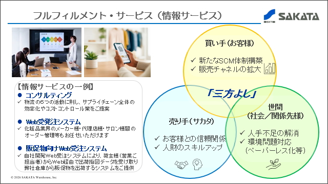 さらに、輸配送・庫内データを活用した物流改善コンサルティングや、Web受発注・販促向けシステムにより、現場業務から情報管理まで一貫した物流改革を実現します。人に優しく、社会や環境にも配慮した「三方よし」の物流をご提供いたします。