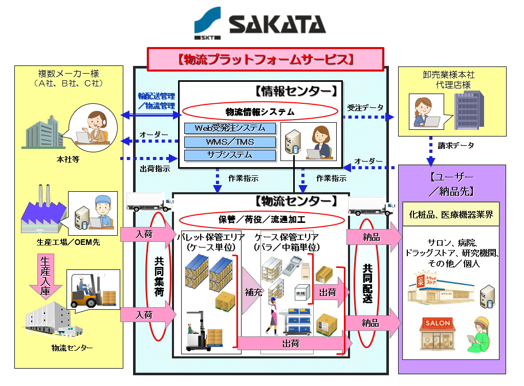 サカタグループでは、「物流プラットフォームサービス」により、化粧品業界様(業務用および一般用化粧品等)、医薬品業界様(一般用医薬品、医薬部外品等)、電機+産業・医療機器業界様等のBtoB・EC物流に対応した物流共同化を推進し、お客様へ更なる品質向上をならびに付加価値サービスのご提供を目指します。